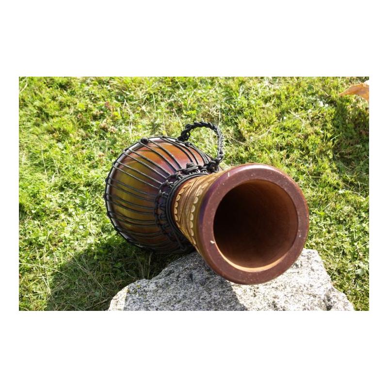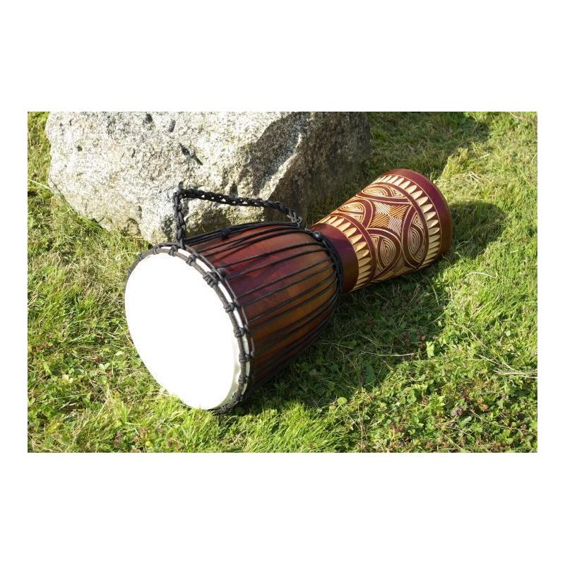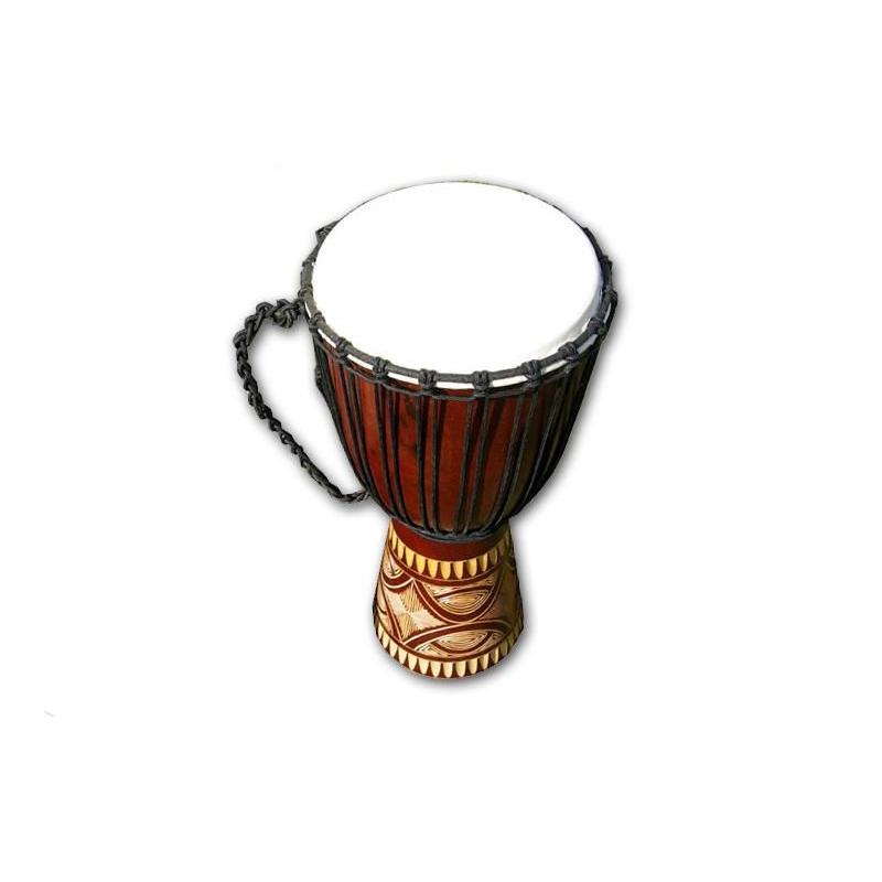 Djembe je drevený bubon, ručne dlabaný do tvaru pohára. Je to rýdzo africký nástroj, ktorý si získal veľkú popularitu po celom svete. Možno ho používať buď ako sólový nástroj alebo v zbore. Skúste ho raz rozoznieť, okamžite si vás získa svojím jedinečným zvukom a stanete sa jeho doživotným fanúšikom. Djembe vzniklo v západnej Afrike, na území súčasnej Guinei, Mali, Burkina Faso a Pobrežia Slonoviny. Tvar bol inšpirovaný africkými malty, v priebehu času sa zdokonaľoval až k dnešnej podobe. Kvalitu, rozsah a farbu zvuku djembe však neurčuje len vonkajší tvar - veľkú úlohu tu zohráva kvalita opracovania celého vnútra djembe. Djembe z nášho e-shopu je ručne dlabaný z jedného kusu dreva a potiahnutý kožou z kozy. Hudobné nástroje z našej ponuky sú ručne vyrezávané a maľované, z toho dôvodu sa môžu v skutočnosti motívy a rozmery mierne líšiť.