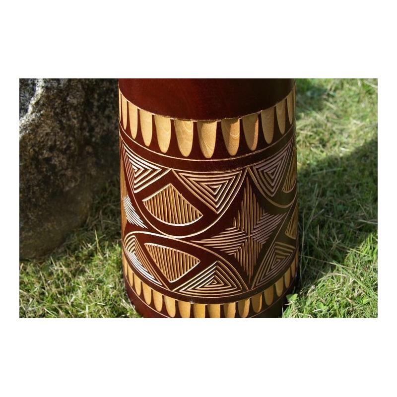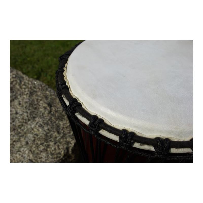 Djembe je drevený bubon, ručne dlabaný do tvaru pohára. Je to rýdzo africký nástroj, ktorý si získal veľkú popularitu po celom svete. Možno ho používať buď ako sólový nástroj alebo v zbore. Skúste ho raz rozoznieť, okamžite si vás získa svojím jedinečným zvukom a stanete sa jeho doživotným fanúšikom. Djembe vzniklo v západnej Afrike, na území súčasnej Guinei, Mali, Burkina Faso a Pobrežia Slonoviny. Tvar bol inšpirovaný africkými malty, v priebehu času sa zdokonaľoval až k dnešnej podobe. Kvalitu, rozsah a farbu zvuku djembe však neurčuje len vonkajší tvar - veľkú úlohu tu zohráva kvalita opracovania celého vnútra djembe. Djembe z nášho e-shopu je ručne dlabaný z jedného kusu dreva a potiahnutý kožou z kozy. Hudobné nástroje z našej ponuky sú ručne vyrezávané a maľované, z toho dôvodu sa môžu v skutočnosti motívy a rozmery mierne líšiť.