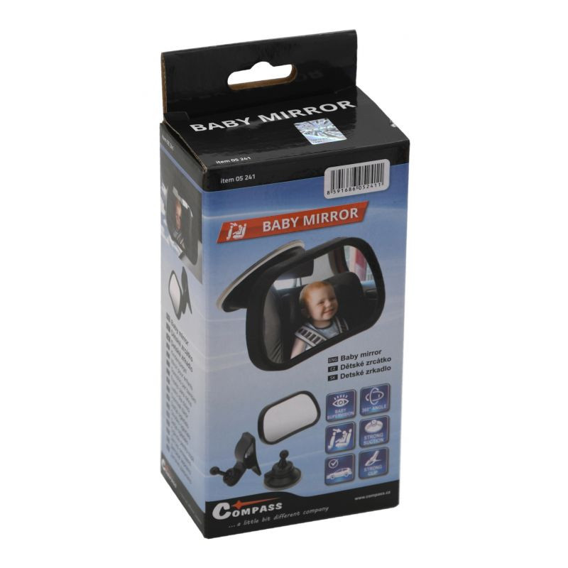 Zakrivená zrkadlová plocha zaisťuje maximálny polomer viditeľnosti, tým znižuje riziko nehôd pri otáčaní a pohľade na zadné sedačky. Zrkadlo je vyrobené z plastu pre zaistenie maximálnej bezpečnosti použitia. Jednoduchá a bezpečná inštalácia bez potreby použiť náradie. Zrkadlo sa osadí nástavcom s klipom, alebo prísavkou a umiestni sa na čelného sklo, alebo slnečnú clonu.