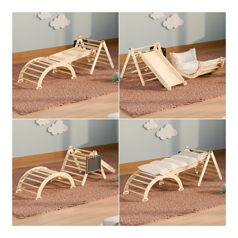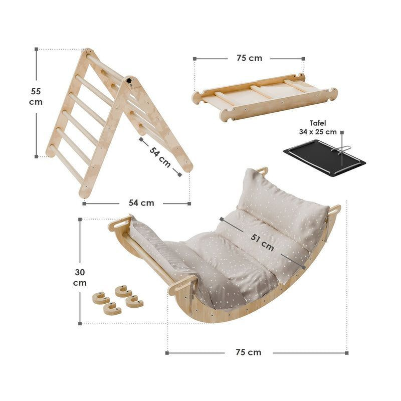 Vytvorte vo detskej izbe skutočné dobrodružné ihrisko s lezeckou konštrukciou z vysoko kvalitného borovicového dreva. Tento multifunkčný herný prvok ponúka kombináciu lezeckého trojuholníka, oblúka, šmýkačky a ďalších prvkov, ktoré podporujú aktívnu hru, koordináciu a motorický vývoj vašich najmenších. Každá časť je pevná a stabilná, takže vaše deti sa môžu hrať bezpečne a šťastne.