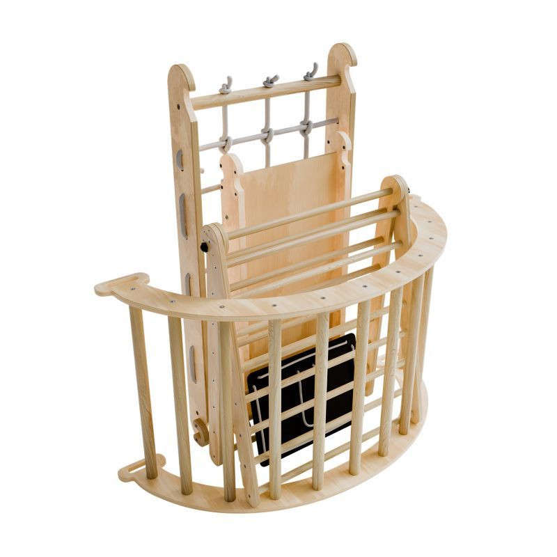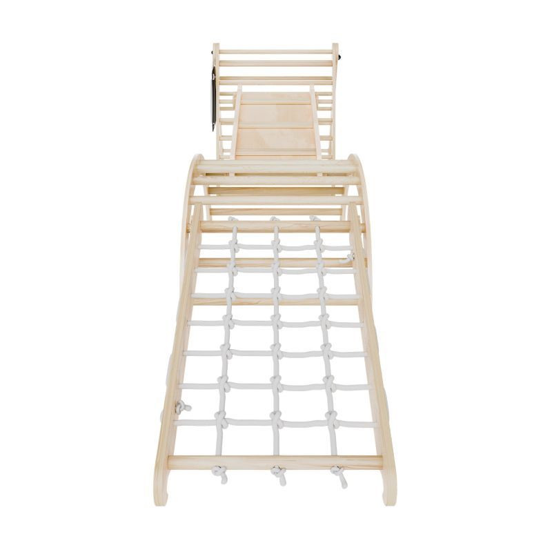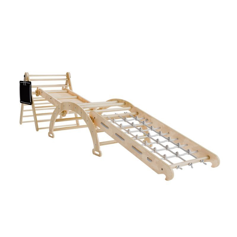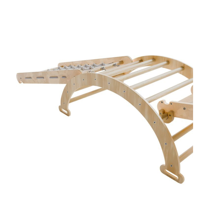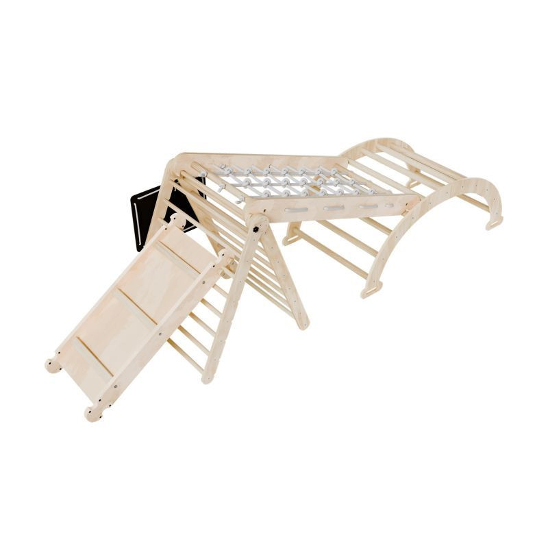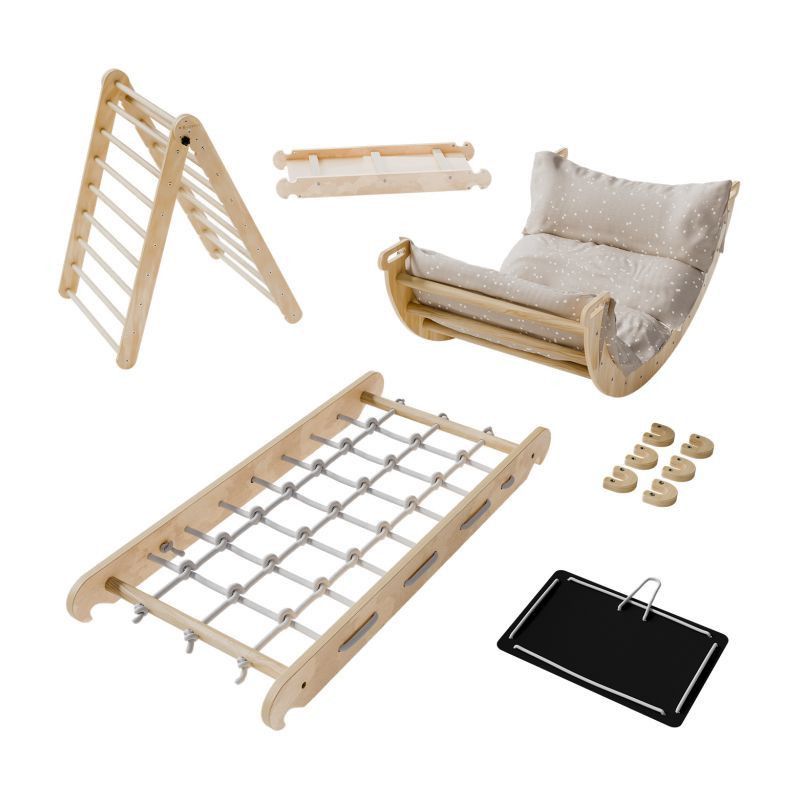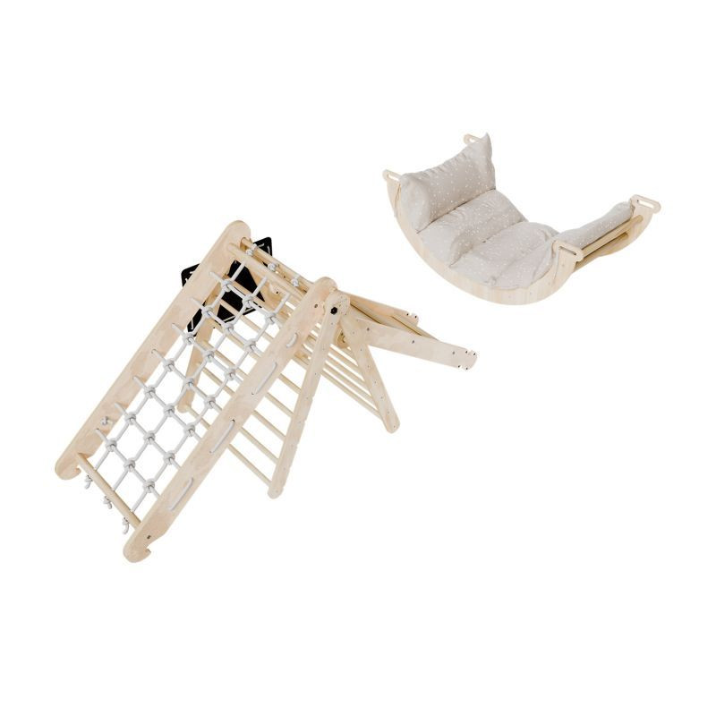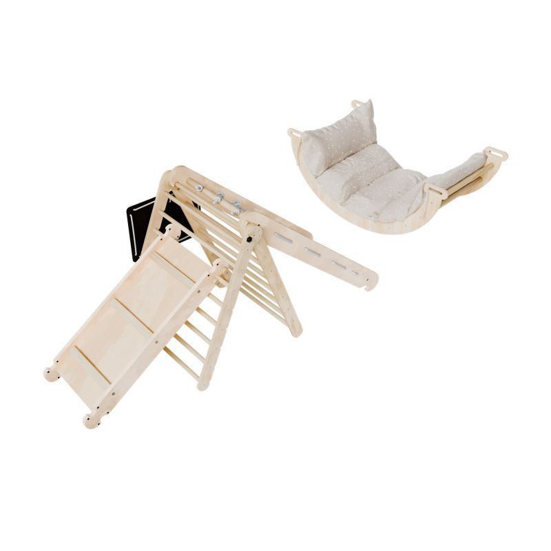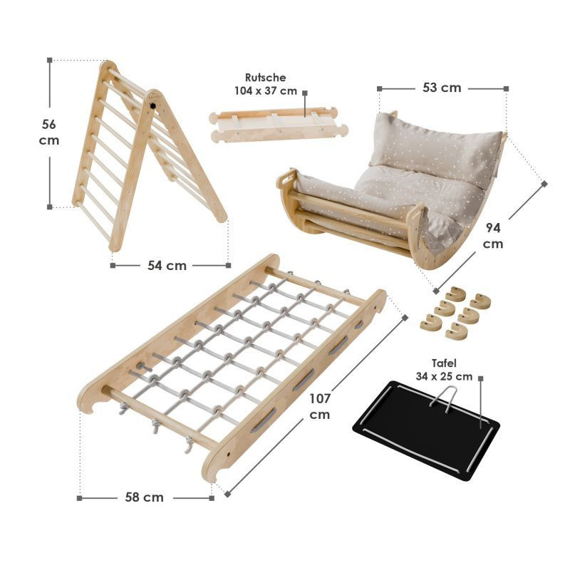 Konštrukcia je vyrobená z kvalitného borovicového dreva a preglejky, ktoré zaisťujú stabilitu a dlhú životnosť. Každý prvok unesie až 50 kg a vďaka modulárnemu prevedeniu je možné jednotlivé časti ľahko kombinovať aj prispôsobovať priestoru. Pohodlný bavlnený vankúš spríjemní hojdanie, zatiaľ čo praktická tabuľka dáva priestor na kreatívne vyjadrenie. Sada je určená na vnútorné použitie a pri hre sa odporúča umiestniť pod konštrukciu mäkkú podložku pre maximálnu bezpečnosť.
