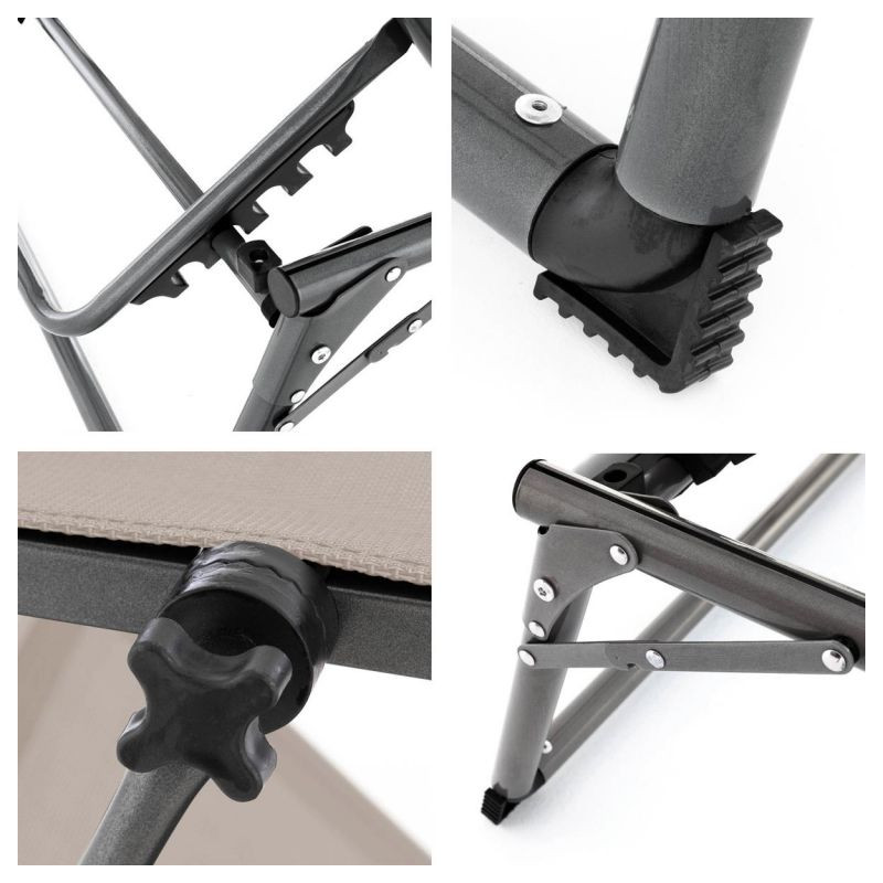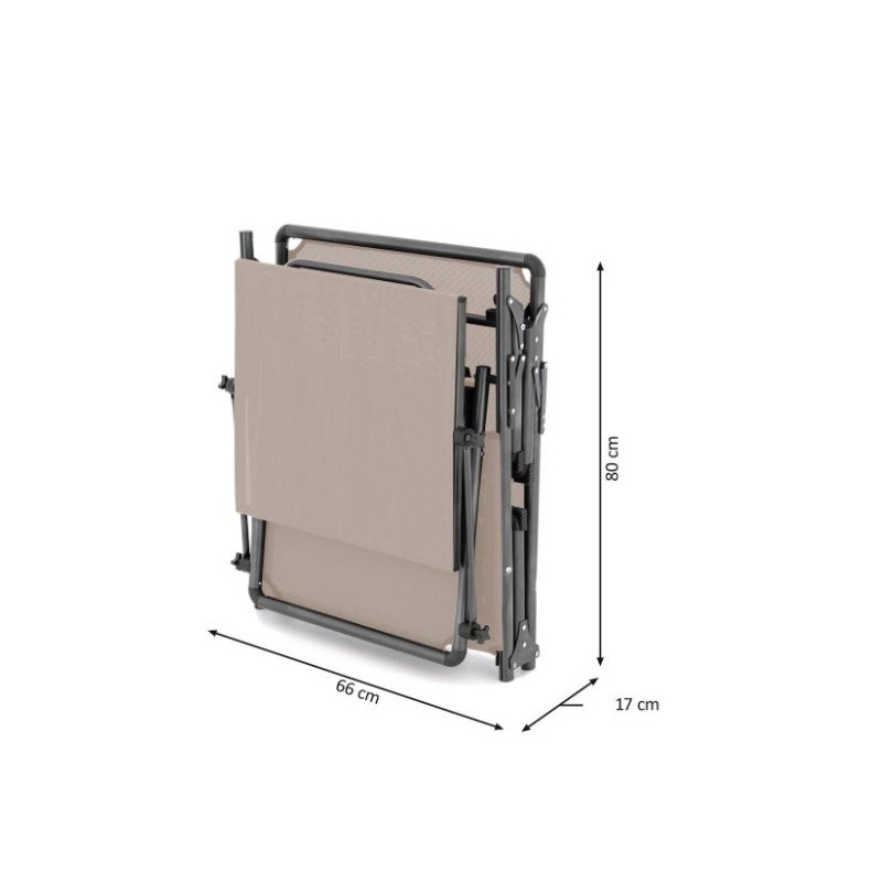 Plážové ležadlo je nastaviteľné do 5 pozícií. Sklopná strieška poslúži ako praktická ochrana proti slnku. Hliníkový rám je mimoriadne robustný a vďaka trom oporným nohám a protišmykovým krytkám s ochranou proti poškriabaniu ponúka stabilné státie na akomkoľvek povrchu. Relaxačné ležadlo je vybavené vodotesným poťahom a možno ho behom chvíľky zložiť. Vďaka svojej skladnosti je vhodným vybavením pre letné cestovanie. Väčšie rozmery lehátka zaručia mimoriadne pohodlie.