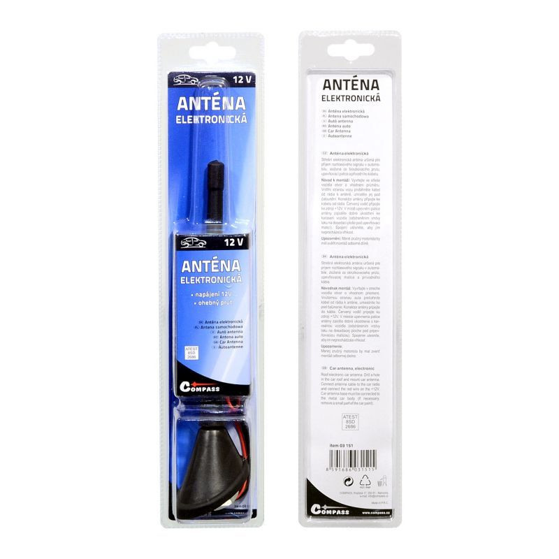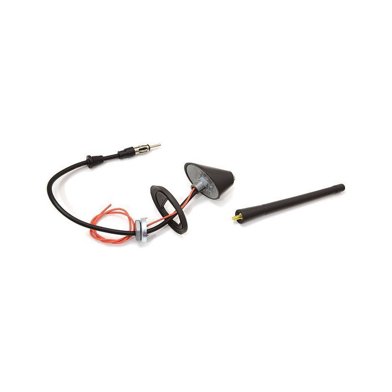 Elektronická anténa montovaná na strechu, určená na príjem rádiových signálov v automobiloch, pozostávajúca z gumovej skrutkovacej tyče, montážnej konzoly a napájacieho kábla.