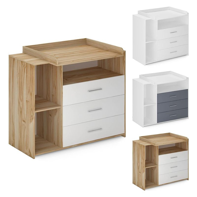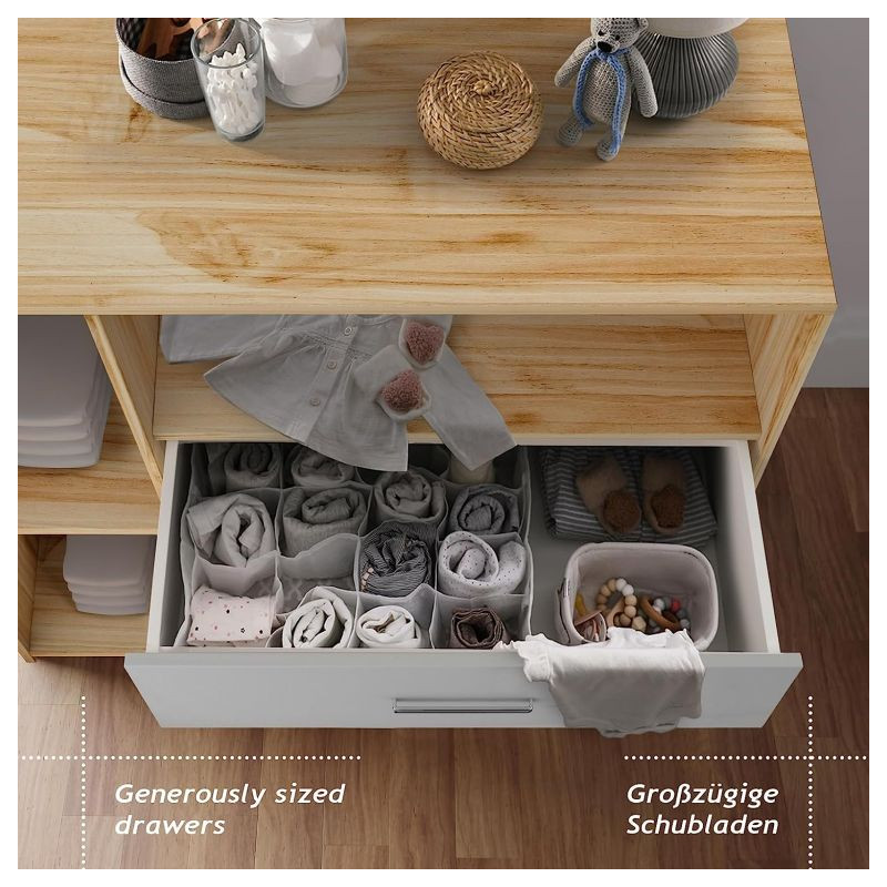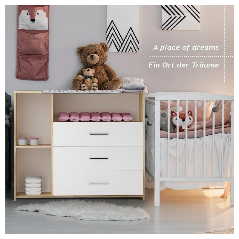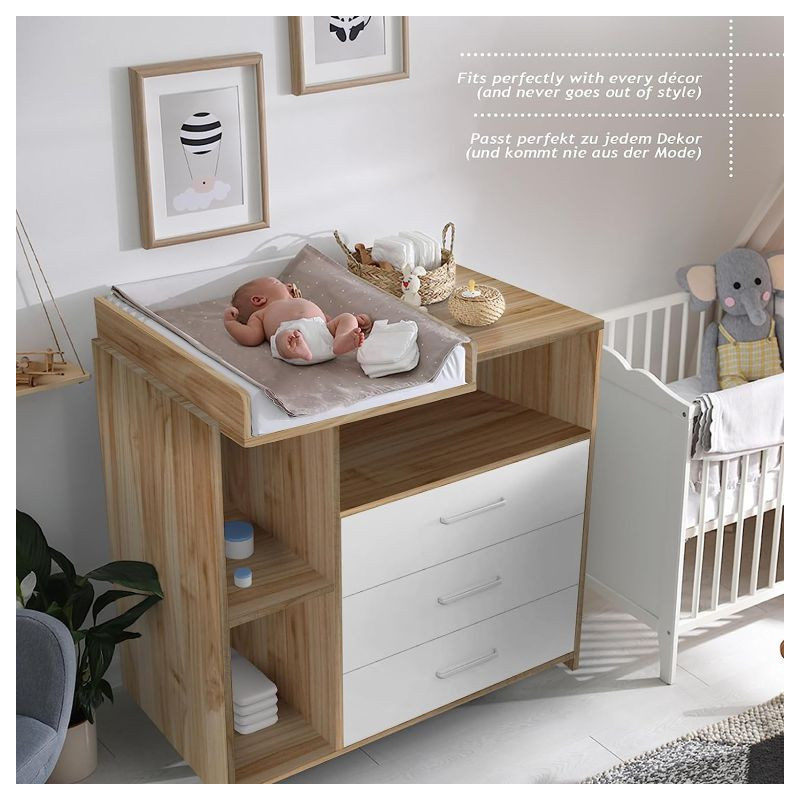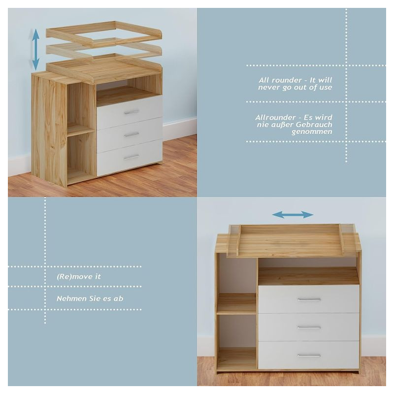 Prebaľovanie na veľkej prebaľovacej ploche - plienky, oblečenie, výrobky pre starostlivosť o dieťa a ďalšie veci na dosah zaistia Vám aj Vášmu dieťaťu pohodlie. Biela farba tohto detského nábytku sa ľahko hodí do rôznych štýlov interiérov. Akonáhle vaše dieťa prebaľovaciemu veku odrastie, môžete prebaľovaciu podložku tohto multifunkčného kusu nábytku jednoducho natrvalo odstrániť. Komoda tak môže byť používaná aj naďalej.