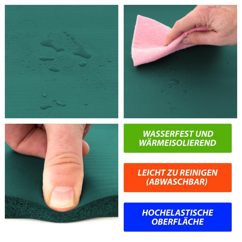 Vysoko kvalitná gymnastická podložka z peny šetrnej k pokožke. Je tiež mimoriadne protišmyková a po použití ju možno ľahko znova zrolovať. Fitness podložka je odolná proti roztrhnutiu a pošmyknutiu je tiež vodeodolná a tepelne izolačná. Bez zmäkčovadiel (bez ftalátov). Tlmí tiež nárazy a zvuk pri náraze, takže môžete chrániť svoje kĺby počas cvičenia. Táto podložka je vďaka svojim tepelnoizolačným vlastnostiam ideálna aj na kempovanie a ako základňa pre lôžko pre hostí.
