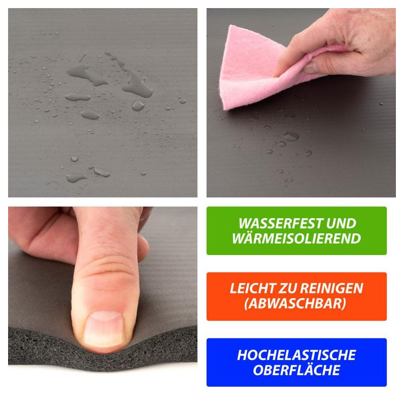 Fitness podložka je odolná proti roztrhnutiu a pošmyknutiu, je tiež vodeodolná (umývateľná) a tepelne izolačná, preto je vhodná aj na kempovanie. Okrem toho tlmí nárazy, takže je šetrná ku kĺbom. Bez zmäkčovadiel (bez ftalátov). Táto vysoko kvalitná gymnastická podložka z peny šetrnej k pokožke presvedčí výškou (hrúbkou) 15 mm. Po použití ju možno ľahko znova zrolovať.