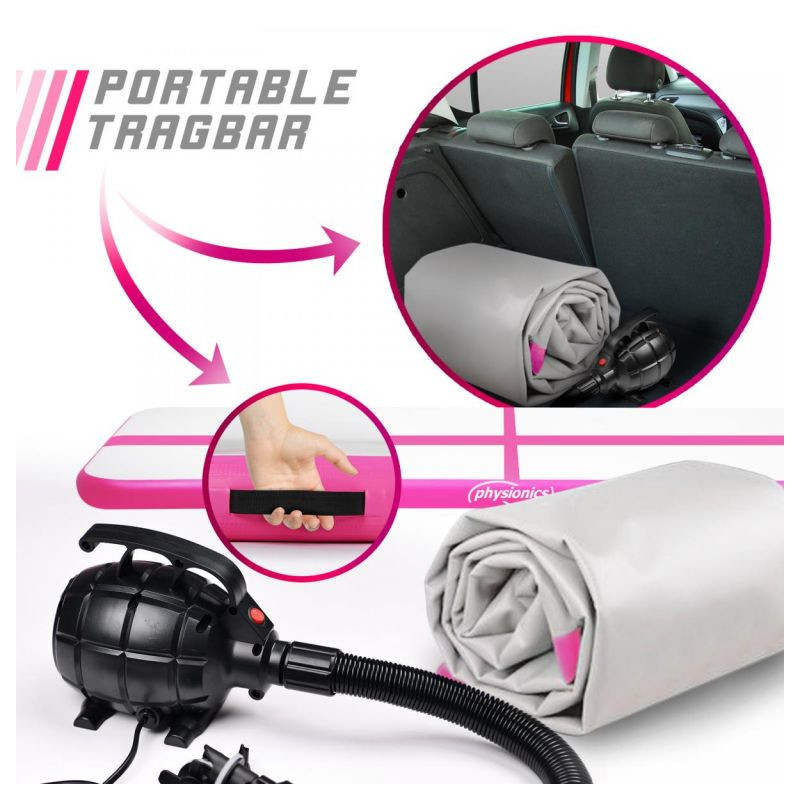 Naša gymnastická žinienka je 10 cm hrubá a je vyrobená z PVC plachty, dvojstenného materiálu, ktorého hlavnou vlastnosťou je udržať si tvar a stabilitu konštrukcie pri vonkajšom tlaku a nárazu. Tento komplet je vybavený elektrickou vzduchovou pumpou a opravnou sadou.