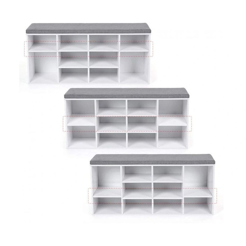 Botník ponúka 10 priestranných priehradok s hĺbkou 30 cm, vhodných pre topánky až do veľkosti 44. Nastaviteľné prepážky umožňujú ukladanie aj vyššej obuvi, napríklad členkových topánok. Stabilná konštrukcia unesie až 150 kg, takže sa naň môžete bez obáv posadiť.