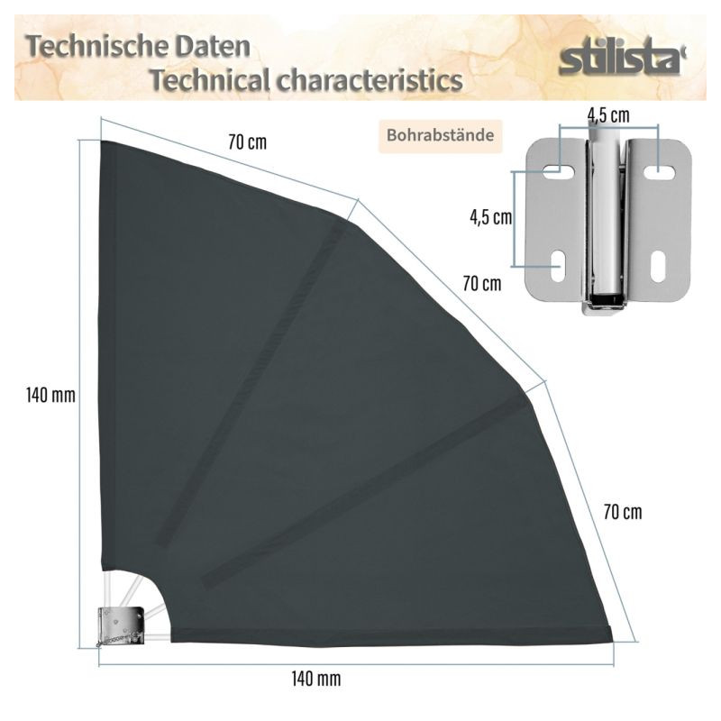 Balkónová zástena STILISTA Vás ochráni nielen pred zvedavými pohľadmi, ale aj pred slnečným žiarením UV 50+ a vetrom. Naša diskrétna zástena na ochranu súkromia harmonicky zapadne do Vášho balkóna, terasy alebo záhrady. Po použití je možné balkónovú zástenu ľahko zložiť a ušetriť tak miesto. Dodáva s montážnym materiálom a ochranným krytom.