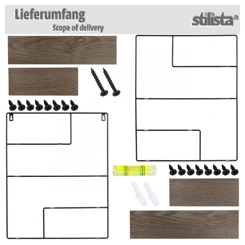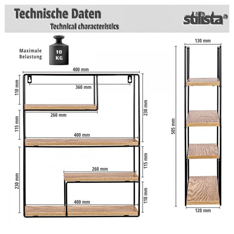 Nástenná dizajnová polička "obdĺžnik" je testovaná drevovláknitá doska MDF podľa štandardnej dyhy E1. Kompletná polica je testovaná na škodlivé látky. Vďaka jednoduchému rámu možno závesnú policu dokonale kombinovať s ďalším nábytkom.