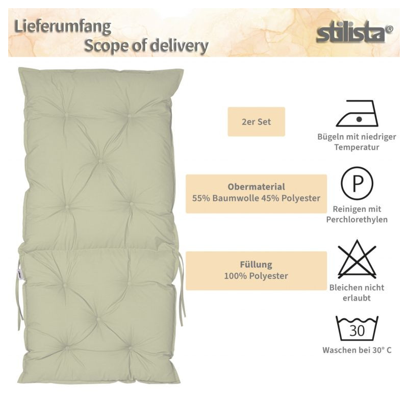 Štyri popruhy a nariasený gumový záchytný opasok na každom vankúši stoličky zabraňujú nepríjemnému skĺzavaniu. Membránová výplň z dutých vlákien zároveň podporuje priedušnosť vankúša. Vďaka 8 cm silnému polstrovaniu je vankúš stoličky mimoriadne pohodlný a po sedení sa vracia do pôvodného tvaru. Vodoodpudivý a ľahko udržiavateľný poťah zabraňuje priamemu vniknutiu kvapalín.
