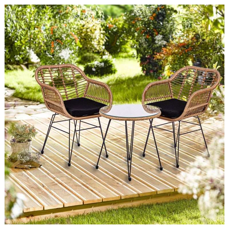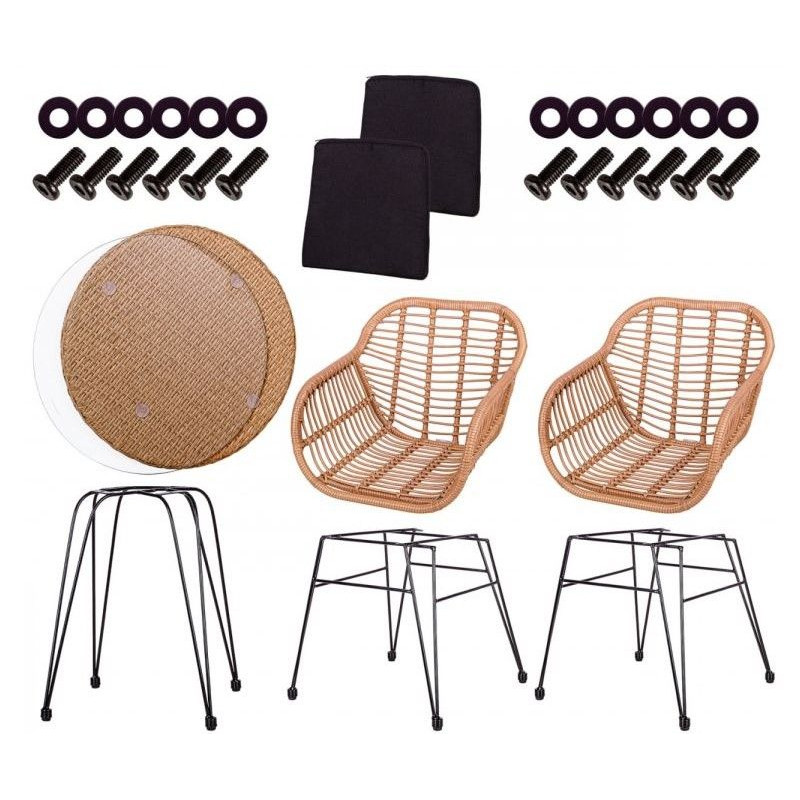 Naša balkónová súprava v ratanovom vzhľade je vhodná pre vnútorné i vonkajšie použitie. Ergonomicky tvarované kresla s 5 cm silnými sedáky poskytujú vysoký komfort sedenia. Vďaka montovatelným vyrovnávacím skrutkám na nohách stoličiek a stola je možné veľmi ľahko vyrovnať nerovnosti podlahy. Robustný rám záhradného nábytku je vyrobený z pozinkovaného a práškovo lakovaného kovu, ľahko udržiavateľné prútie je vyrobené z vysoko kvalitného polyratanu.