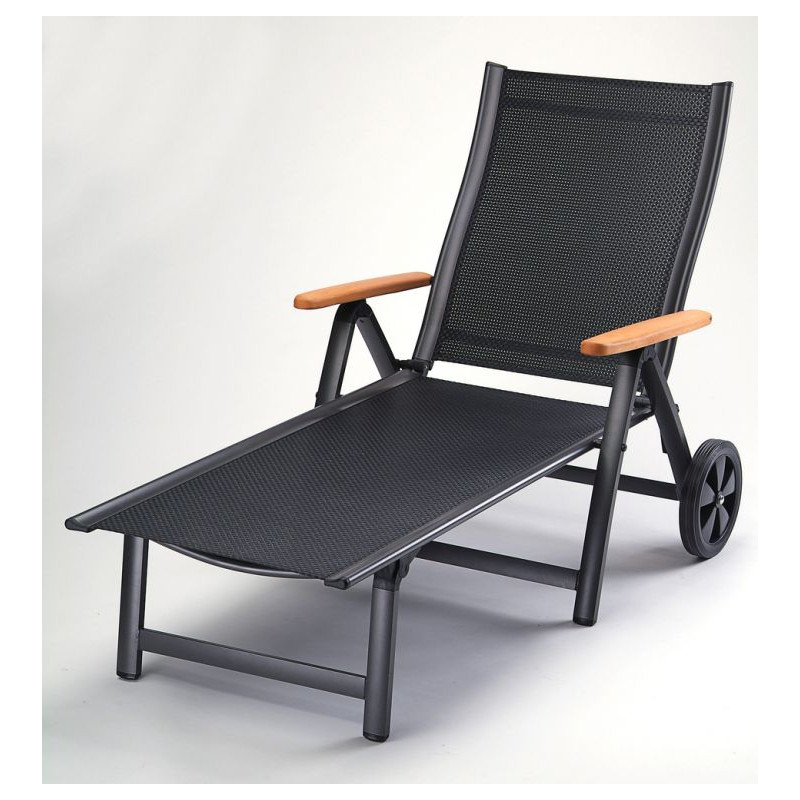 Lehátko polohovacie (7 polôh) vám umožní ten najväčší relax na Vašej záhrade. Hliníková kostra striebornej farby s opierkami na lakte - z eukalyptového drevo FSC. Textília 4 x 4 m je odolná voči počasiu - čierna farba. Pre jednoduchý presun je ležadlo vybavené kolieskami. Certifikát TÜV.